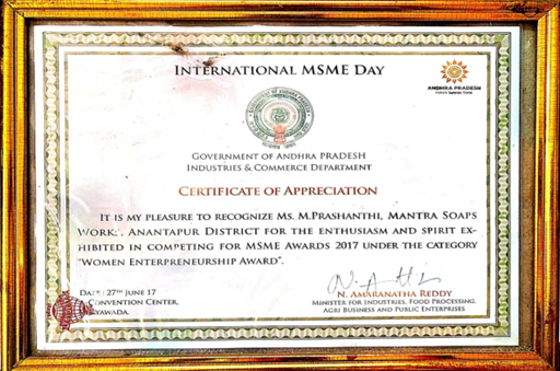 Mrs. Meda Prashanthi received Women Entrepreneurship Award on International MSME day.